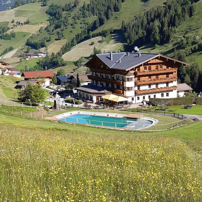 Unser ****Hotel liegt auf 1130 m Höhe, ruhig und abgeschieden von jeder Hektik mit unverstellten Blick auf die umliegende Bergwelt inmitten saftig duftender Bergwiesen.
