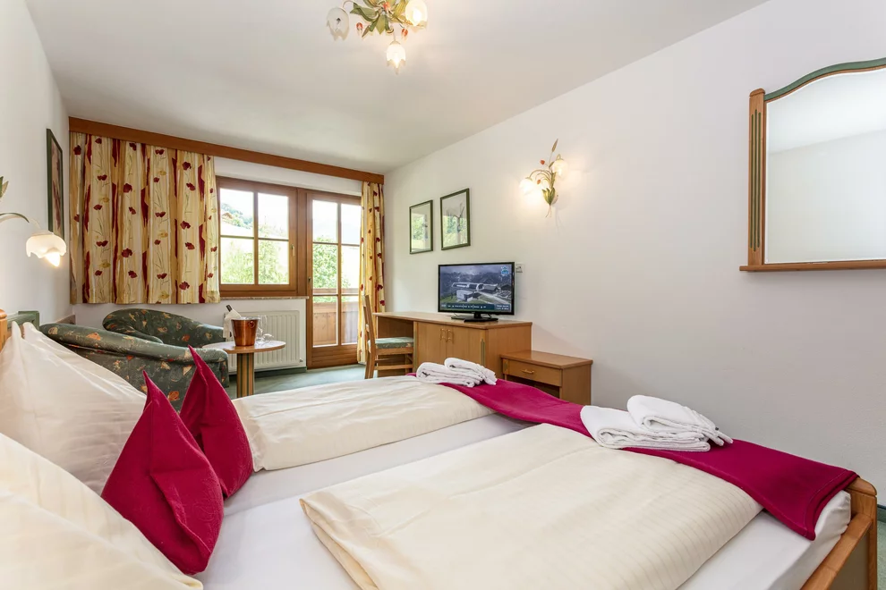Genießen Sie Ihren Urlaub im klassischen Doppelbettzimmer mit Zusatzbett. Helle Farben charakterisieren diese Räume. Badezimmer mit Dusche, Haarfön, großt. mit Balkon, TV, gratis WLAN & Safe, gehören selbstverständlich auch zu diesem Zimmertyp.
