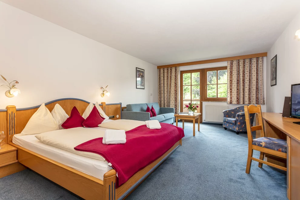 Auch die Junior-Suiten haben wir mit viel Platz kreiert, hier finden bis zu vier Personen Platz. Ein Doppelbett, eine komfortable Ausziehcouch, ein Badezimmer mit Dusche, seperatem WC, Fön sowie ein Balkon gehören zu dieser Zimmerkategorie.