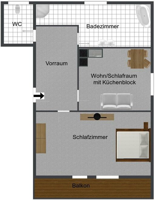 Das Appartement ist modern und freundlich eingerichtet. Besteht aus 1 Schlafzimmer, 1 Wohnschlafraum, Diele, Badezimmer und getrenntes WC, Balkon, gratis W-Lan