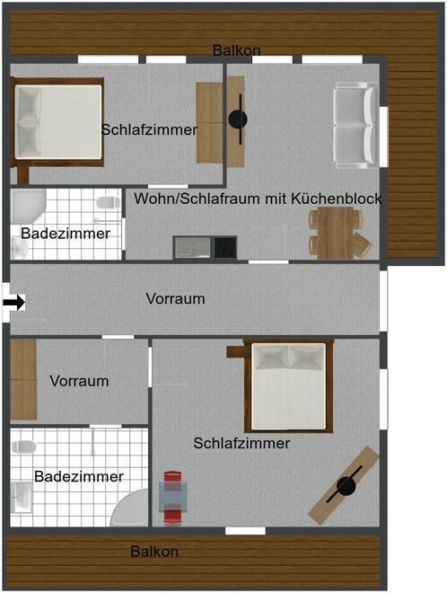 Die Appartements bieten höchsten Komfort - Ausstattung: 2 Schlafzimmer, Wohnraum mit Küchenzeile, Diele, 2 Bäder, SAT-TV, Balkon, gratis W-Lan