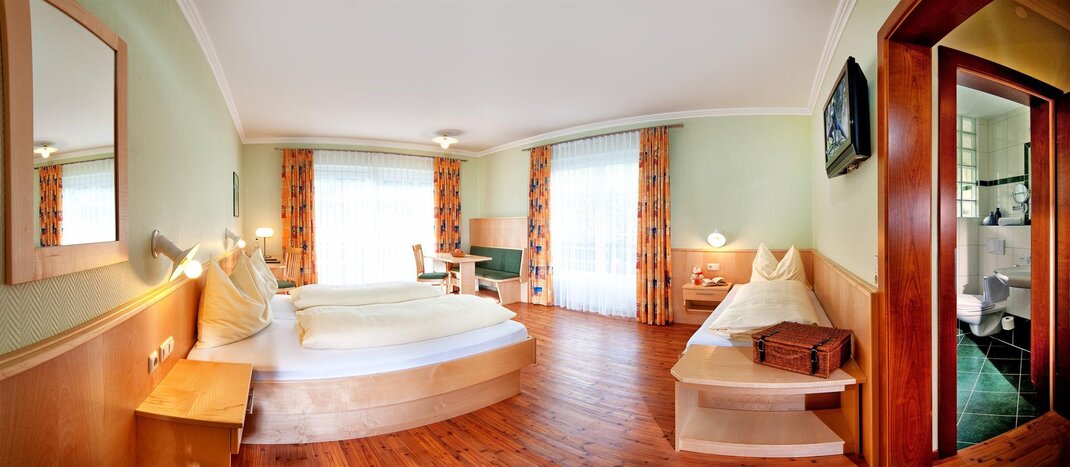 Unsere schönen Doppelzimmer mit Balkon bestechen mit viel Geräumigkeit und Komfort - bestehend aus Dusche/WC, Flachbild-TV, Minibar, Safe, sowie einer gemütlichen Sitzecke. Natürliches Holz und angenehme Farben verleihen Behaglichkeit und Wärme.