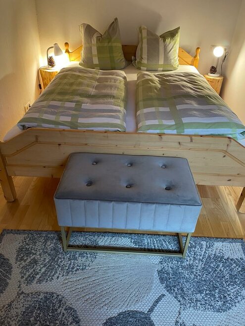 Gr. geräumiger Wohnraum (im 2. Stk. unseres Hauses) Küchenecke, Chouch (als Doppelbett), Eßecke, DU/WC, 1 Sz f. bis 3 Pers. u. 1 Sz f. 2 Pers. (erweiterbar auf bis 4 Pers., wenn Kinder sind mit 1 bis 2 Stockbetten). Vorraum mit Garderobe, gemütl. Mansarden.