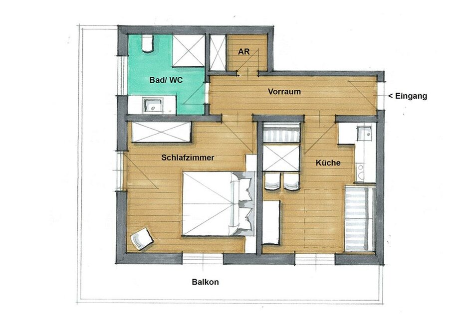 Größe 23 m² Belegung 1 - 3 Erwachsene , 0 - 2 Kinder Zimmer 1 Schlafzimmer 1 Zimmerdetails