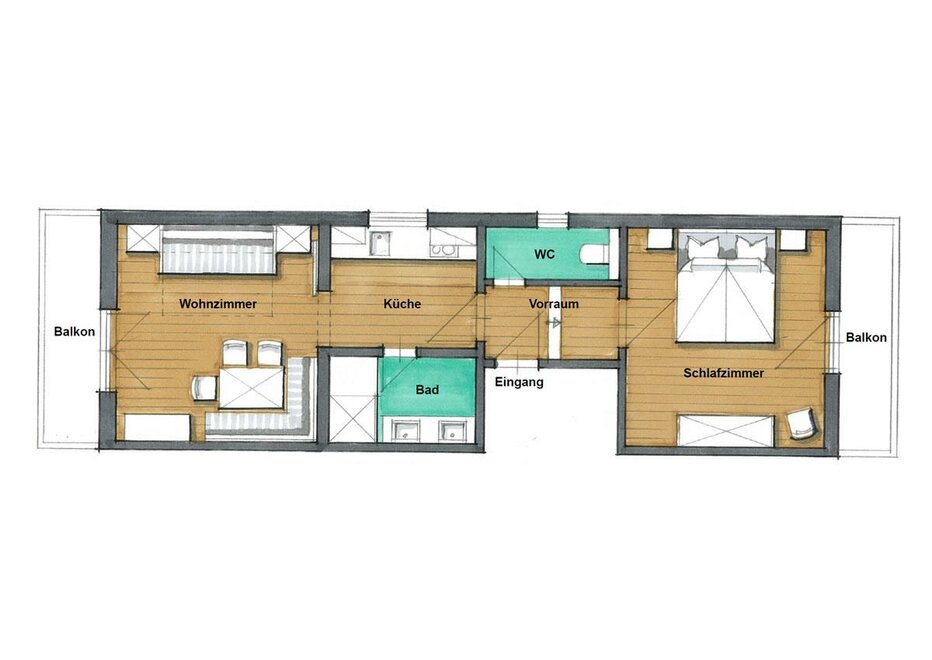 Toaster, Safe, Balkon, Schrankbett, Geschirrspülmaschine, Wohnküche, Balkon (teilweise), Backofen, Bettwäsche vorhanden, Tisch- und Küchenwäsche, Küchenzeile, Elektroherd, Teppich Wohnzimmer, Gefrierfach, Haarföhn, Teppich Schlafzimmer, Haustiere nicht erlaubt, Balkonmöbel, Mikrowelle, Vorraum, WiFi, Nichtraucher Zimmer/App./Whg., Kaffee-Maschine, Fußende der Betten offen, Kühlschrank, Kabelfernsehen, Dunstabzug, Sitzgruppe, Handtücher vorhanden, Terrasse, Fernseher, Wasserkocher, Wohn-/Schlafräume getrennt