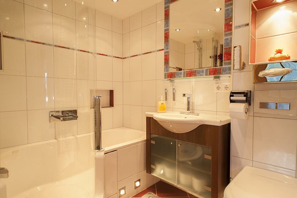 Zur gehobenen Ausstattung der Suite „Bergjuwel“ gehört auch ein edles Badezimmer mit Badewanne, Erlebnis-Dusche, Doppelwaschbecken, WC, ein Heizkörper als Handtuchwärmer etc. Wellnessbereich im EG.Ausstattung Zimmer/Appartement