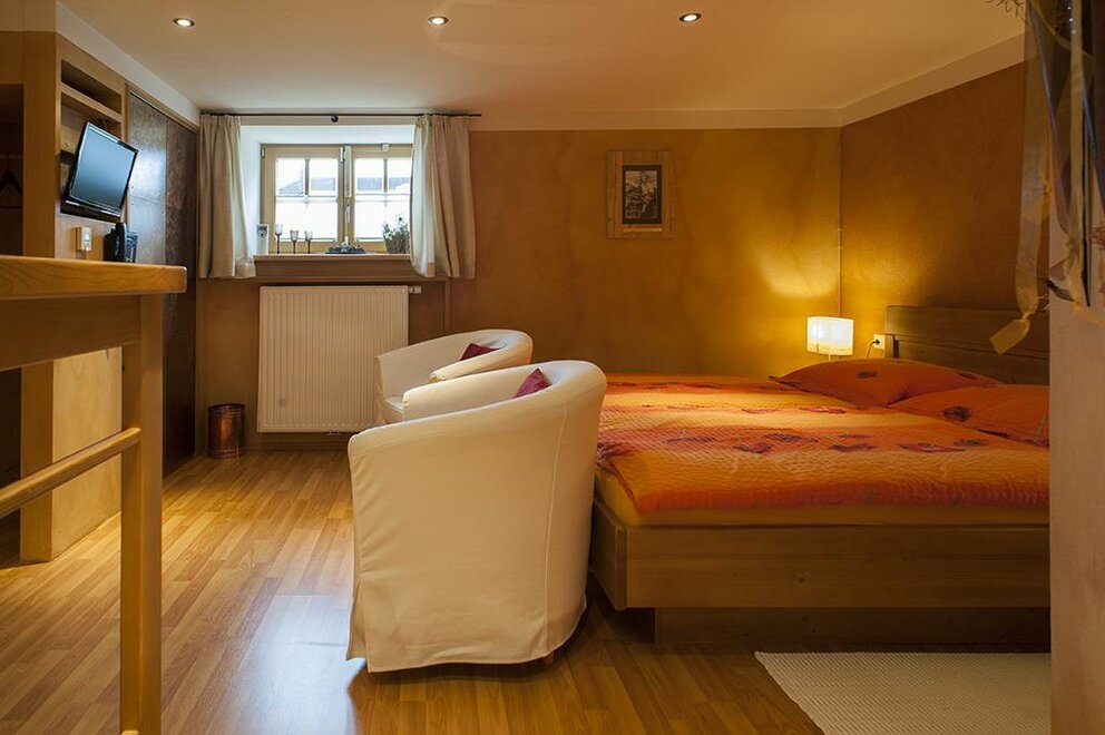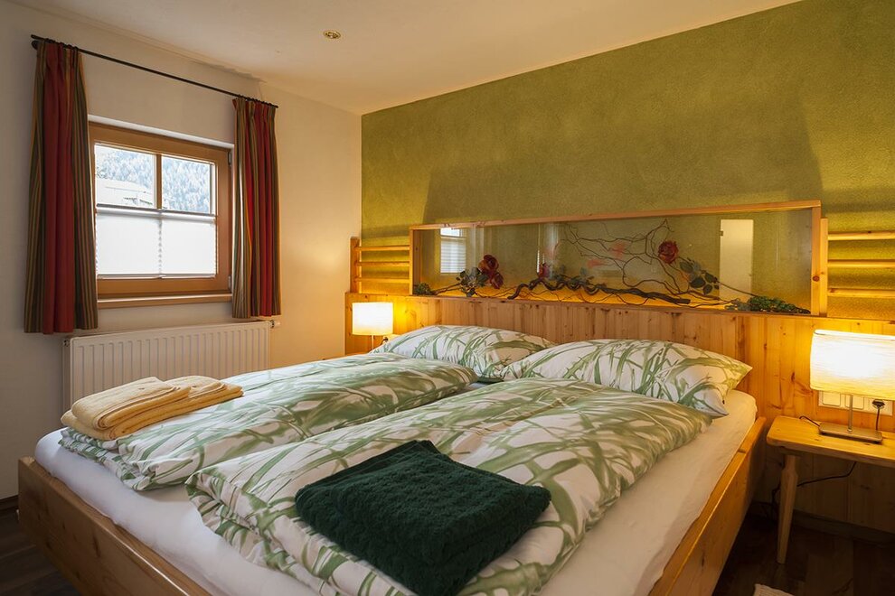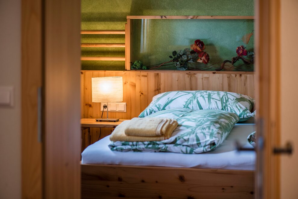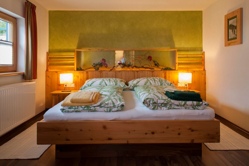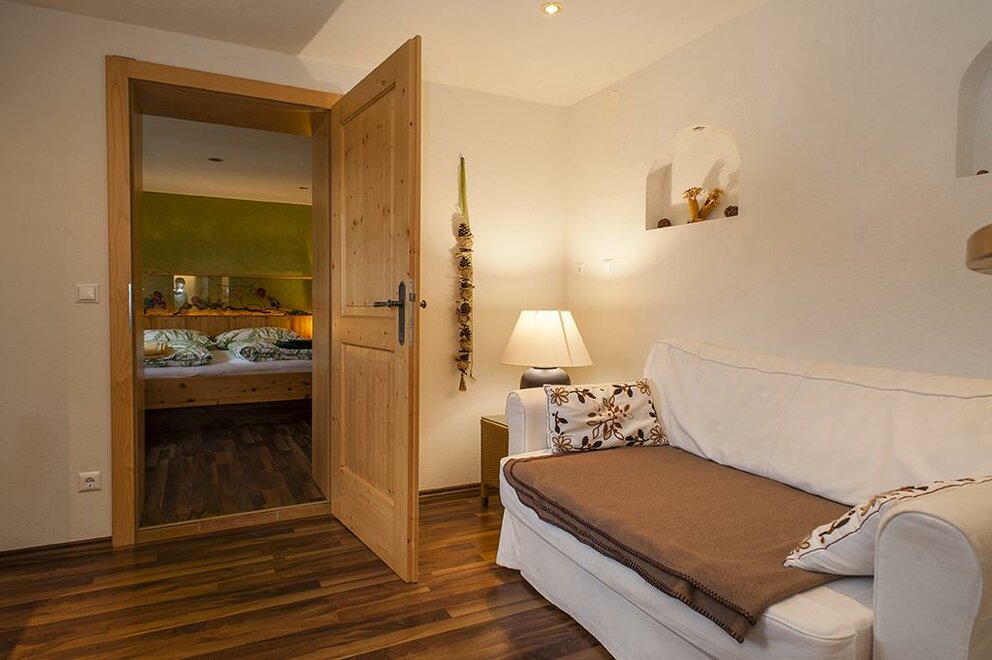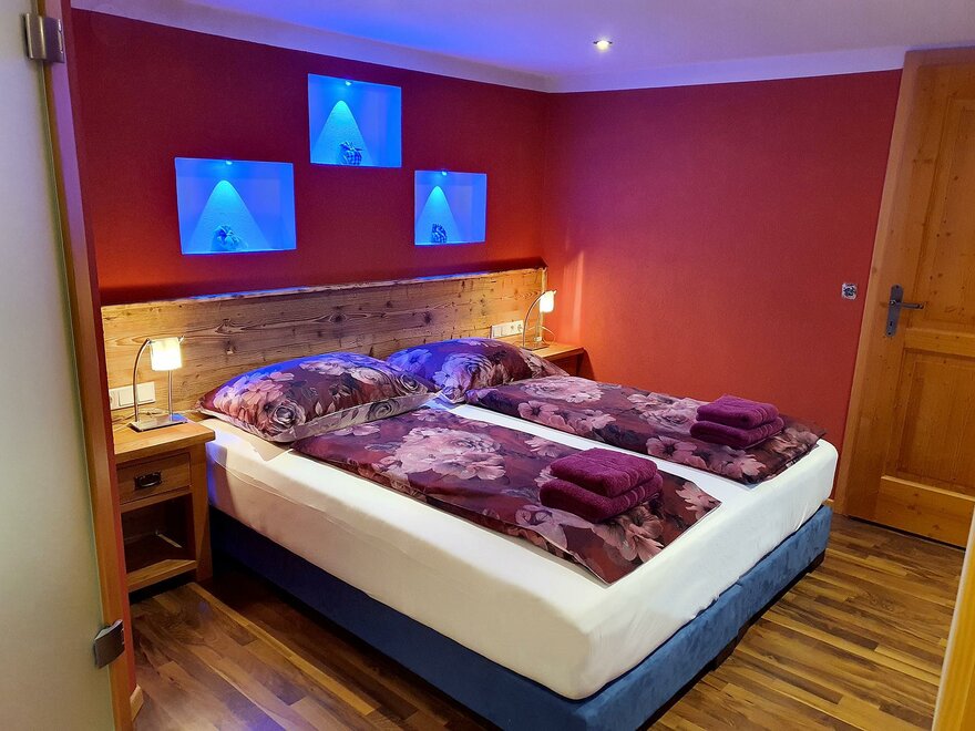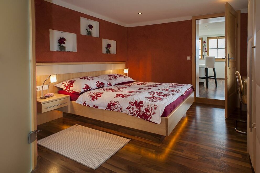 Das Schlafzimmer ist mit einem romantischen Doppelbett ausgestattet, das Bad mit gehobenem Standard: kombinierte Dusche / Badewanne, WC, Waschbecken, Heizkörper als Handtuchwärmer und außergewöhnliche Armaturen. Im Wellnessbereich Zirben- und Altholzsauna, Infrarotkabine.Ausstattung Zimmer/Appartement