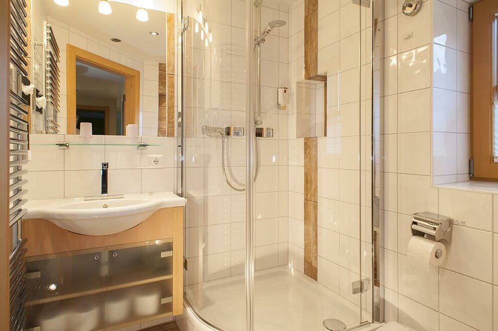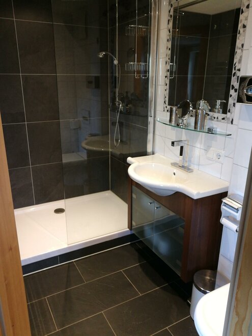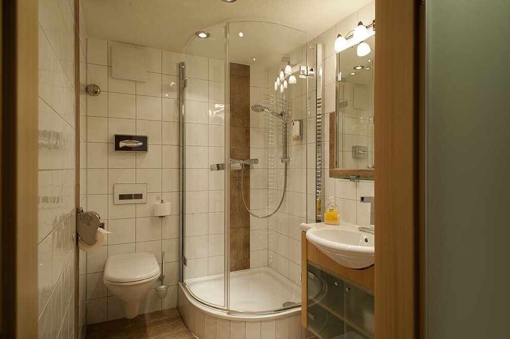 Zur gehobenen Ausstattung der Suite „Alpenrosen“ gehört auch das moderne Bad mit Dusche, WC, Waschbecken, einem Heizkörper als Handtuchwärmer und außergewöhnlichen Armaturen.