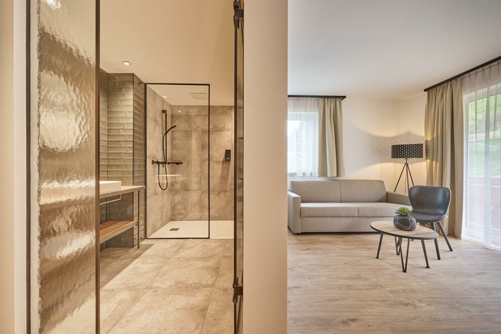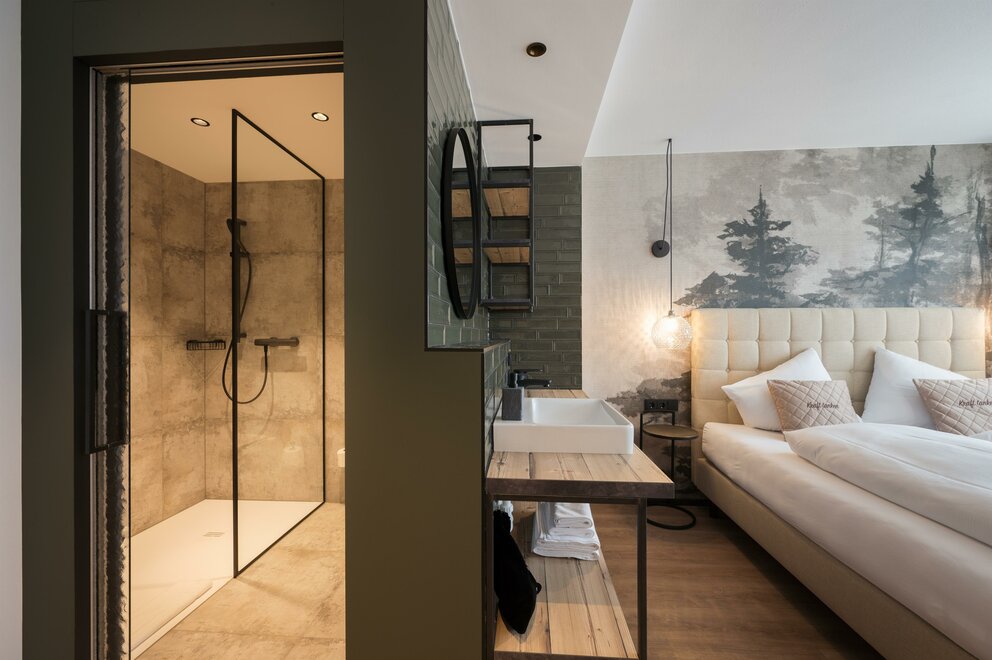 NEU ab Mai 23 : Moderne Doppelzimmer 35m² und Balkon 5m², Doppelcouch zum Ausziehen, mit unschlagbaren Weitblick über das gesamte Tal, mit viel Liebe zum Detail eingerichtet, Dusche & WC getrenntAusstattung Zimmer/Appartement