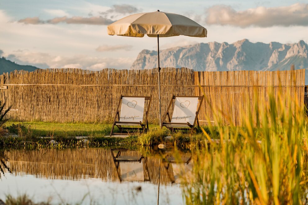 Highlight im Sommer: Badeteich, Sundowner auf der Terrasse und die ruhige Panoramalage.