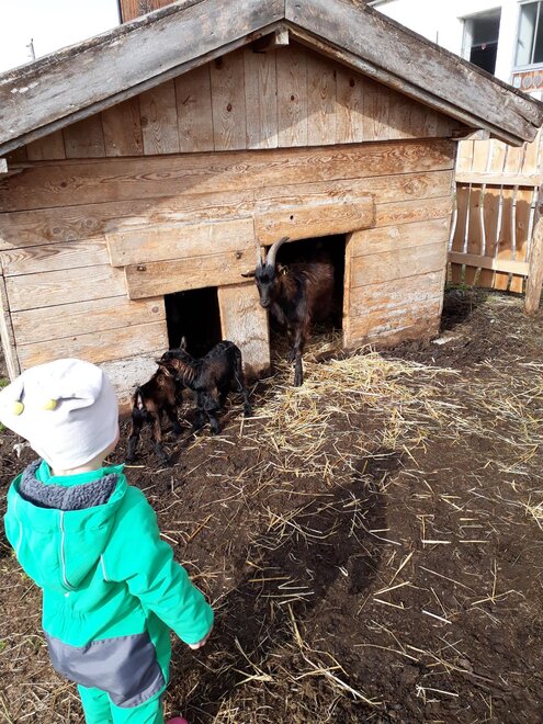 Sehr helles und freundliches Appartement im 1. Stock mit einer großen Wohnküche mit kompletter Küchenausstattung, Sitzecke und Couch, einem Schlafzimmer, Dusche/WC, Vorraum und Balkon mit Blick auf den Spielplatz und die Streicheltiere.