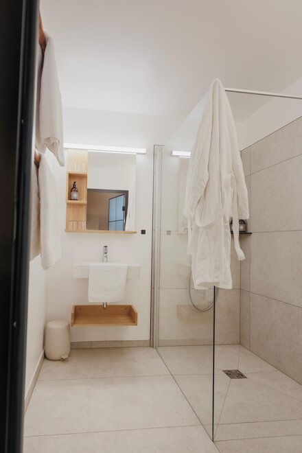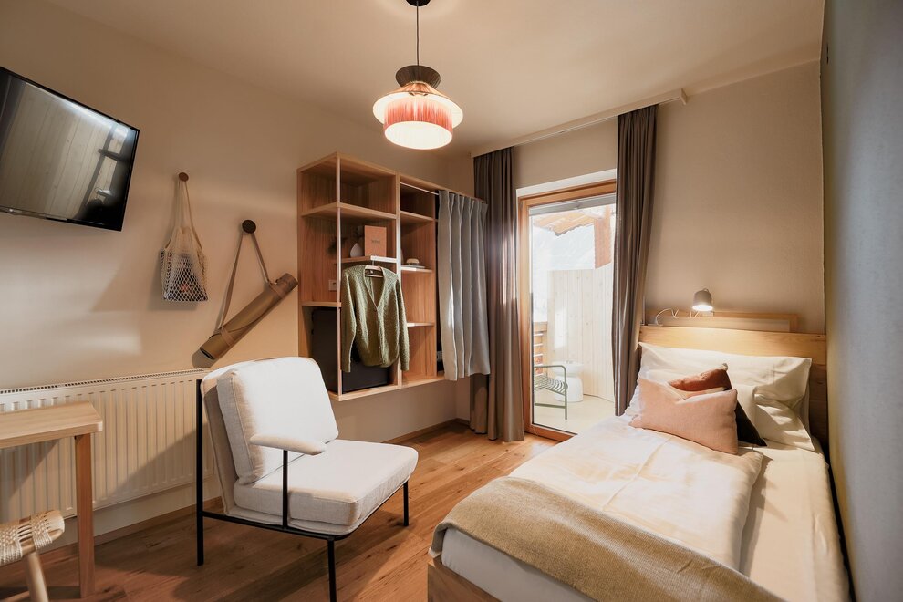 Doppelzimmer, ca. 22m², mit klarem Design und gemütlicher Atmosphäre. Das flow double ist im Erdgeschoß, mit Terasse in den Garten. Hier sind auch Hunde herzlich willkommen. Alle unsere Zimmer sind mit Teeküche ausgestattet, Dusche einem gemütlichen Loungsessel.