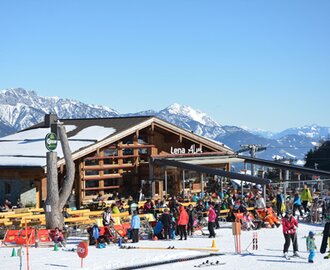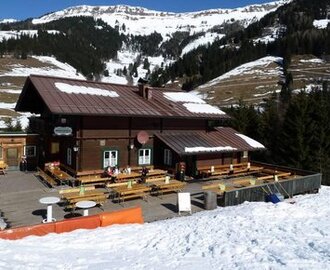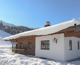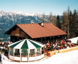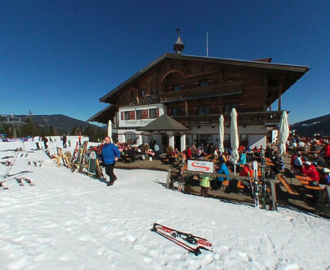 Mitte Abfahrt Vorderfager, in der 300 Jahre alten Hütte verwöhnen wir mit den "Lechneralm-Schmankerln". Große Sonnenterrasse.