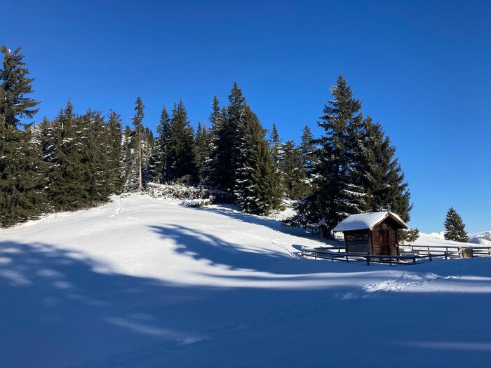 Routen-Verlauf: Beim Speicherteich angekommen, besteht die Wahl zwischen der Route bis zur Kleinen Scharte und der Variante zur Haitzingalm. Die Variante zur Haitzingalm ist wesentlich kürzer und führt durch ein Waldstück direkt zur Skihütte Haitzingalm.