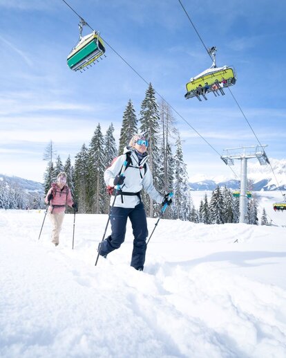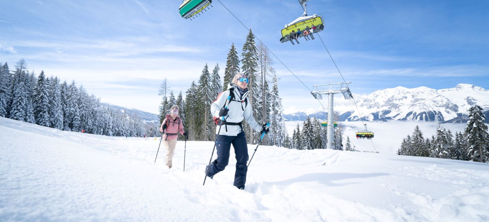 Zwei Skitourengeherinnen steigen durch den Schnee, während über ihnen ein Sessellift mit Skifahrern fährt. | © Josh Absenger
