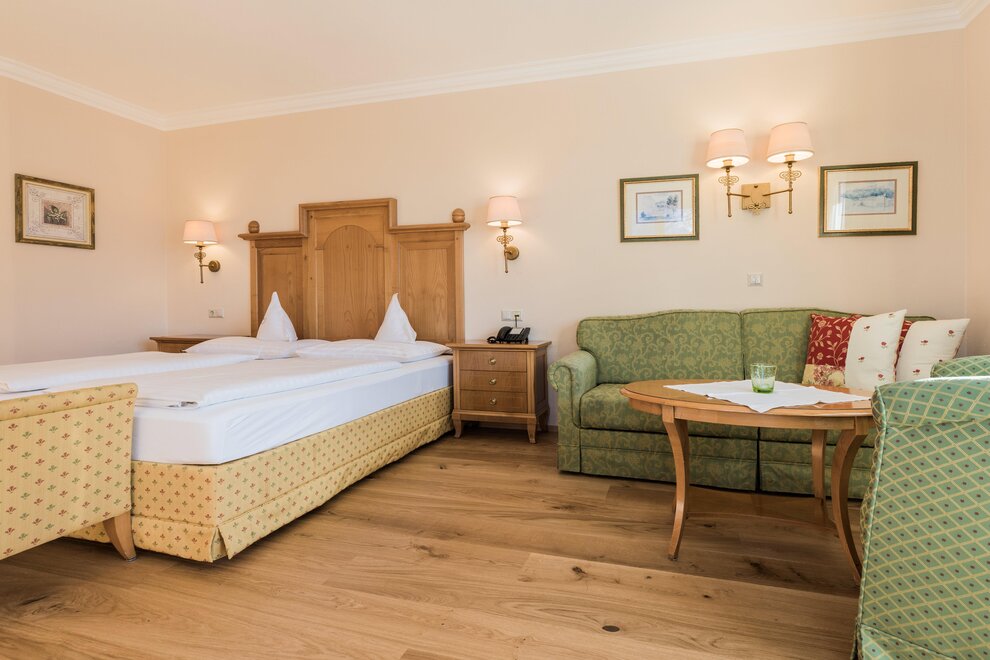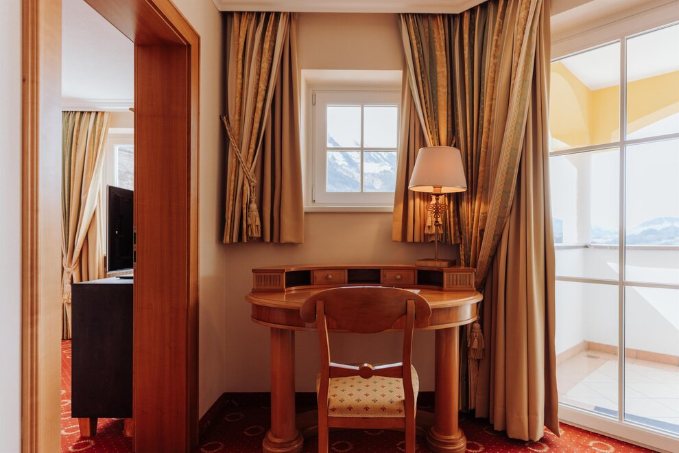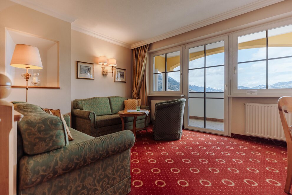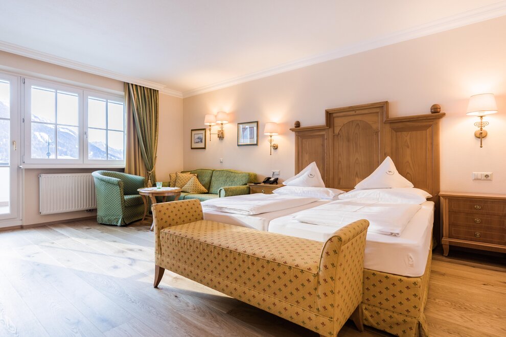 The 40 m² “Amadé de luxe” rooms have a balcony in a particularly quiet mountain location (restricted view). With a pull-out couch, these rooms can accommodate up to 4 people. The bathroom has a bathtub and two sinks, with a separate toilet.