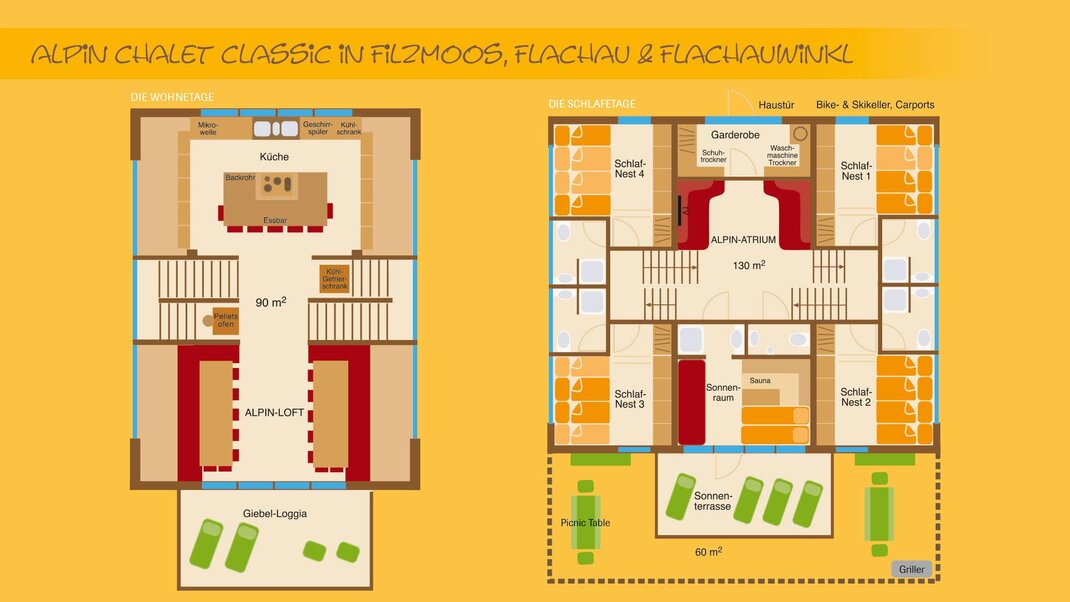 220m2, alpine loft with kitchen, alpine atrium, 4 sleeping nests with shower / toilet, sun room with sauna and double bed.