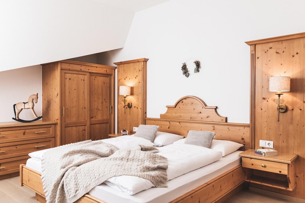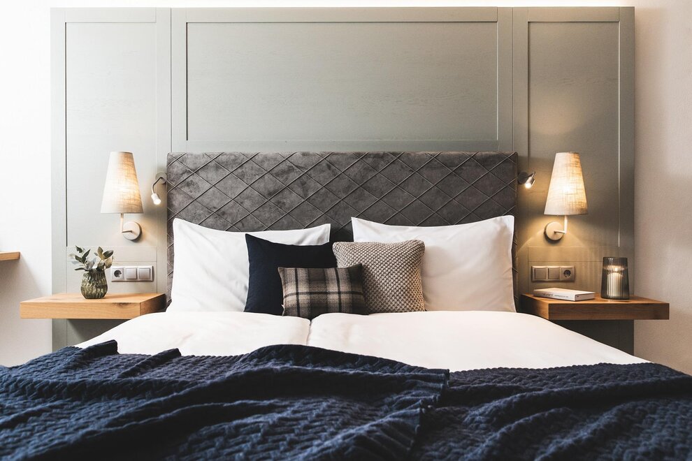 Double room in Alpine lifestyle, modern bathroom with rain shower, mostly double washbasin, hairdryer, towel dryer, separate WC, telephone, cable flat screen TV with radio, WiFi, minibar, safe, desk, balcony.
