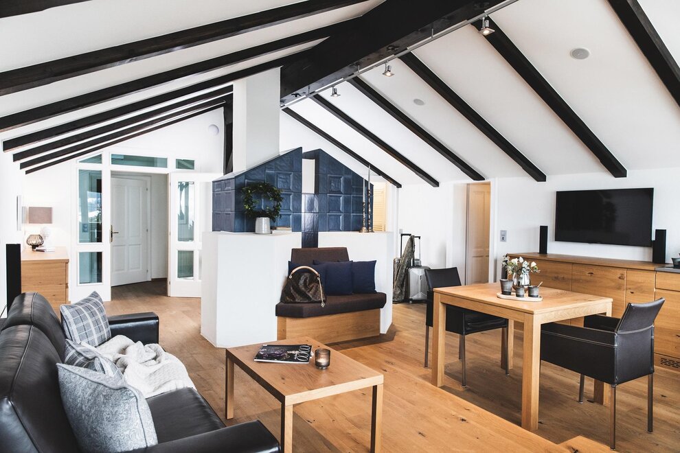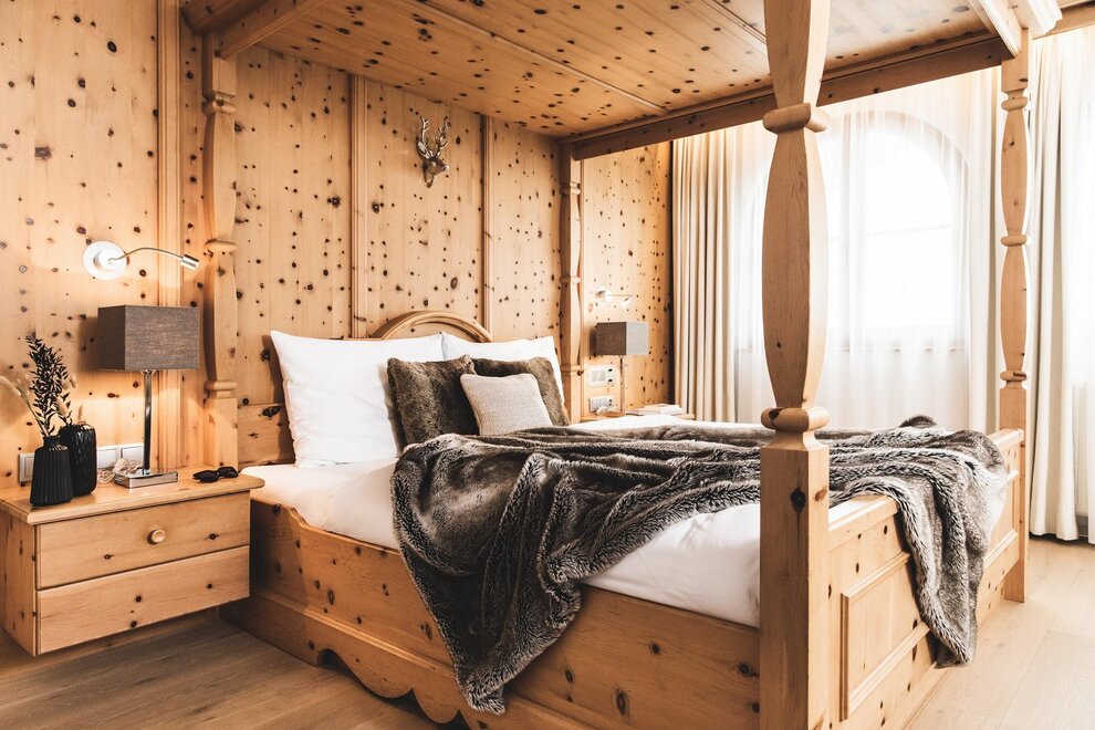 Spacious room in Alpine lifestyle, living and sleeping area with box spring bed, comfortable couch, modern bathroom with tub, double washbasin, rain shower, hairdryer, towel dryer, separate WC, telephone, cable flat TV with radio, WiFi, minibar, safe, desk, some with balcony.