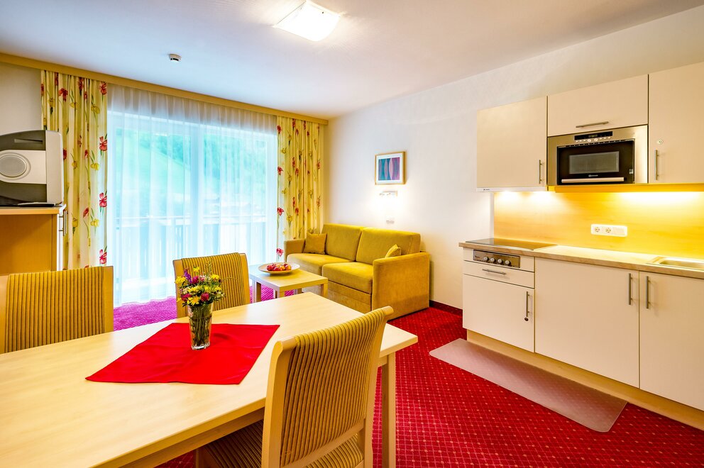 Spacious modern studio, with separate sleeping and living area, large balcony, and views of the mountains of Hüttschlag. Perfect for families of up to 5 persons