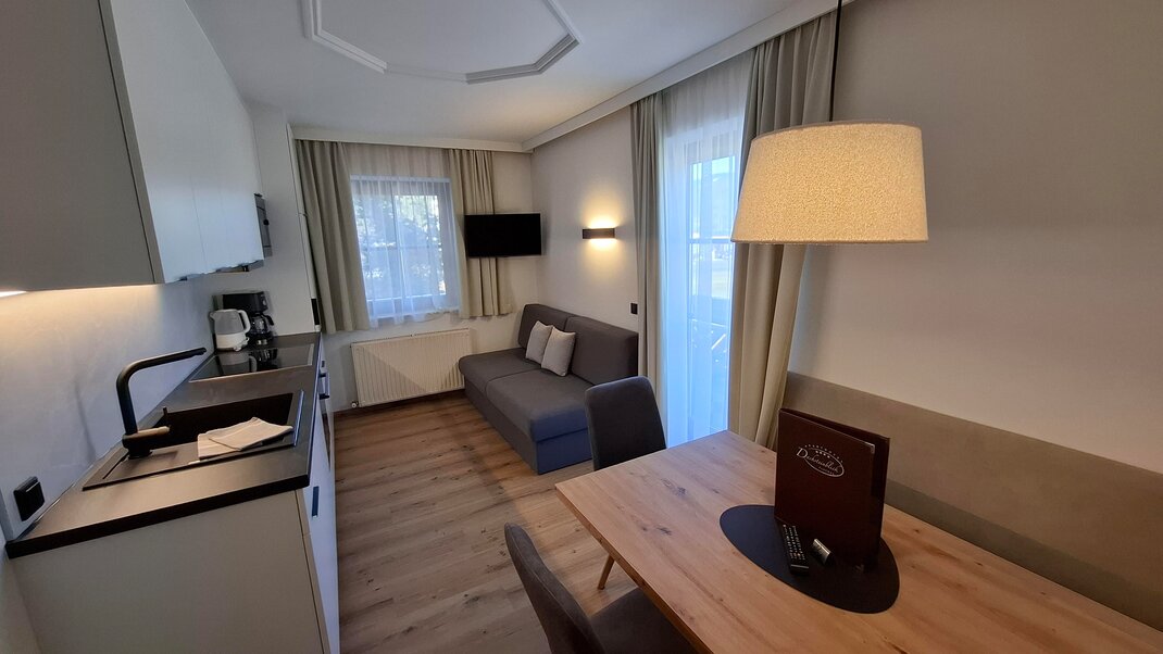 The apartments for 4 to 6 persons comprise two separate bedrooms, a large kitchen-living room, 2 flat-screen TVs, a bathroom with shower and an extra WC. The view of the surrounding mountain world awaits you from the balcony.