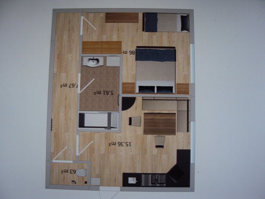 Apartment for 2-3 people (50m2) with 1 bedroom (3 beds) and a kitchen-living room, bathroom (with bathtub) and separate WC.