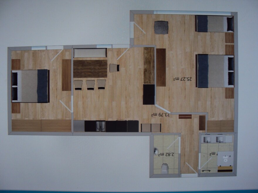 excluding final cleaning and local taxApartment for 5-7 people with 2 bedrooms, 2 bathrooms, 2 WCs, and a fully equipped living kitchen with a balcony. The apartment spans 2 floors - approximately 85 m2 - also suitable for 2 small families.