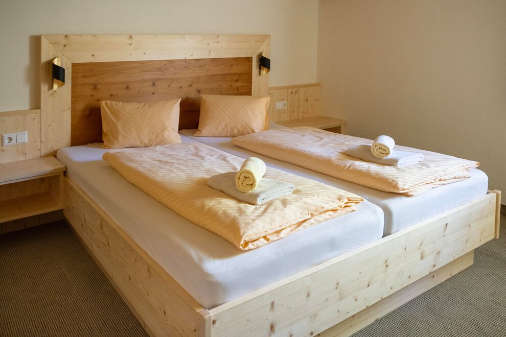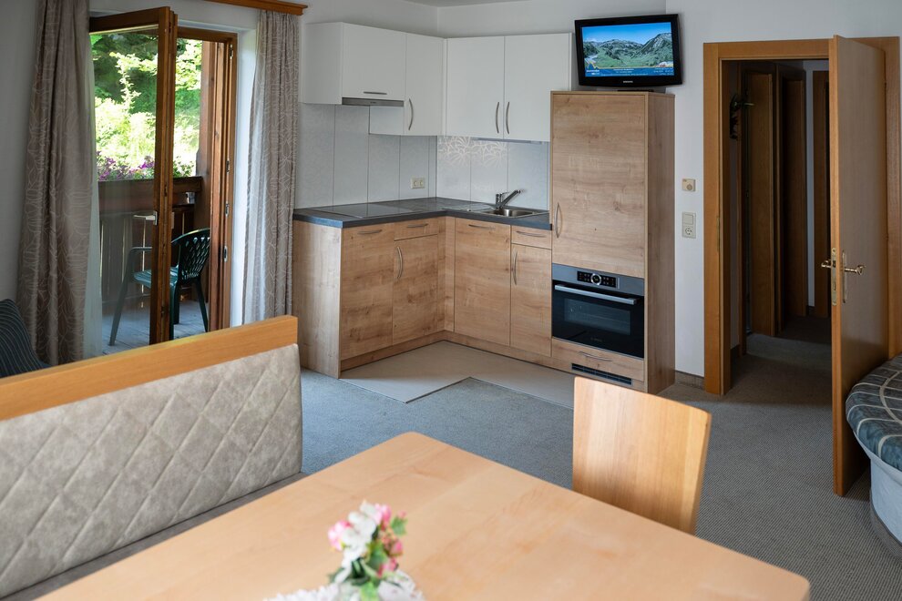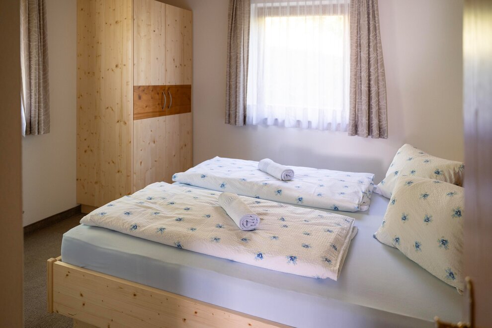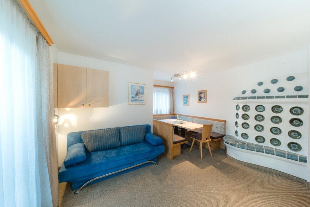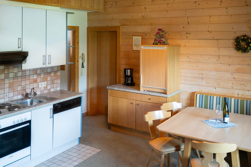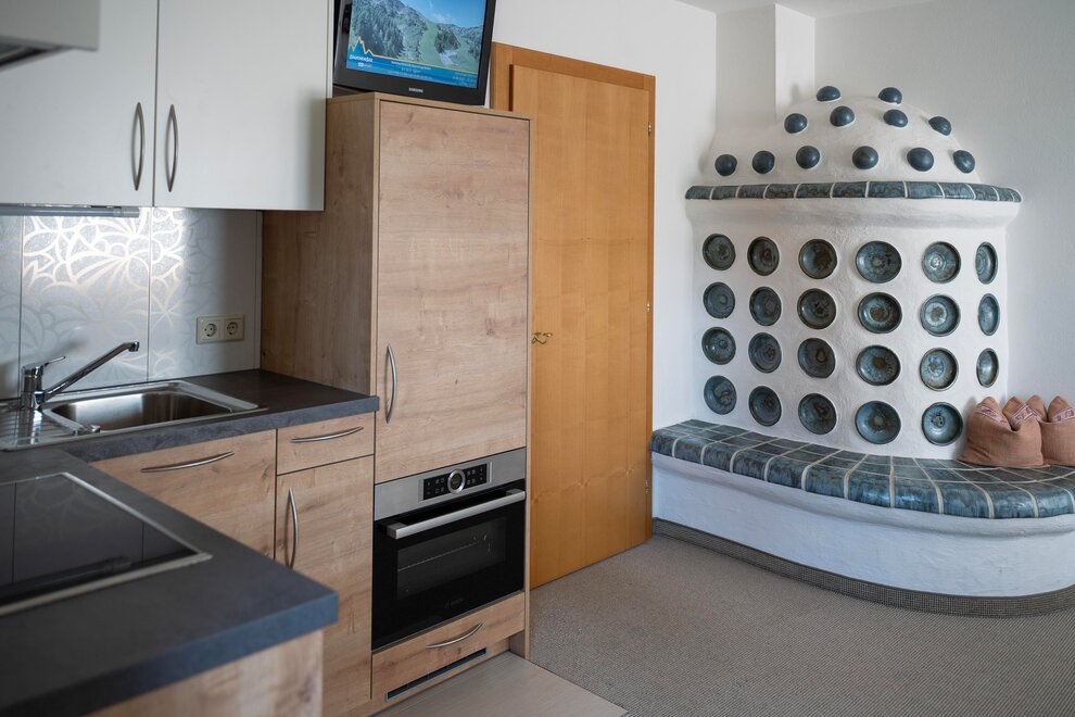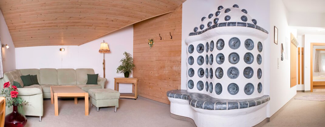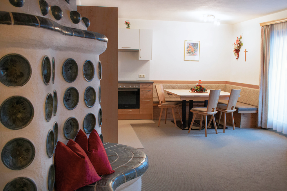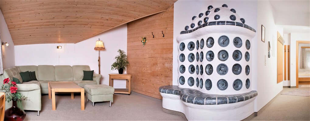 Apartment for 8 people (96qm), 3 bedrooms, bathroom, toilet, kitchen/diner with dishwasher and dining table, large living room with sofa-bed and a tiled stove, balcony.