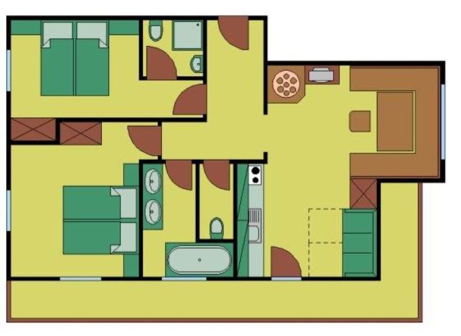 Living room with tiled stove, kitchenette, dishwasher and comfy dining table. sofa-bed for 2 people and 2 bedrooms for 2 people each, balcony, bath/WC and shower/WC, double washbasins