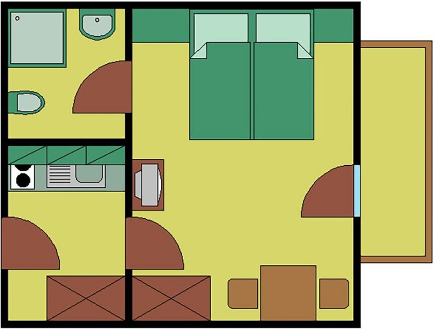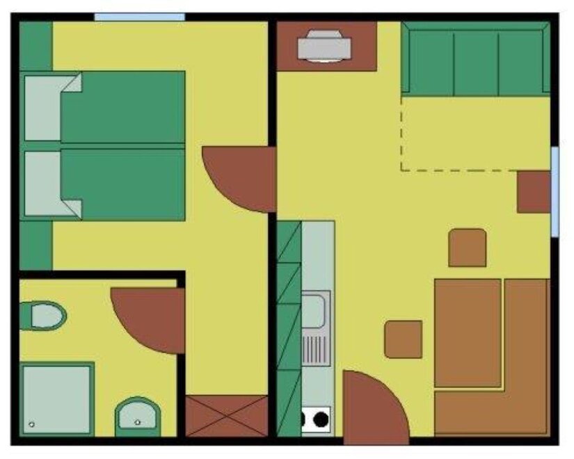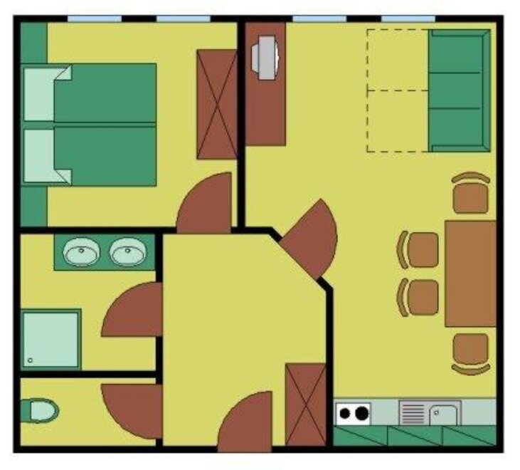 Apartment for 4 people (30 sqm), 1 double room, bathroom with 2 washbasins and shower, kitchen/diner with comfortable sofa-bed.