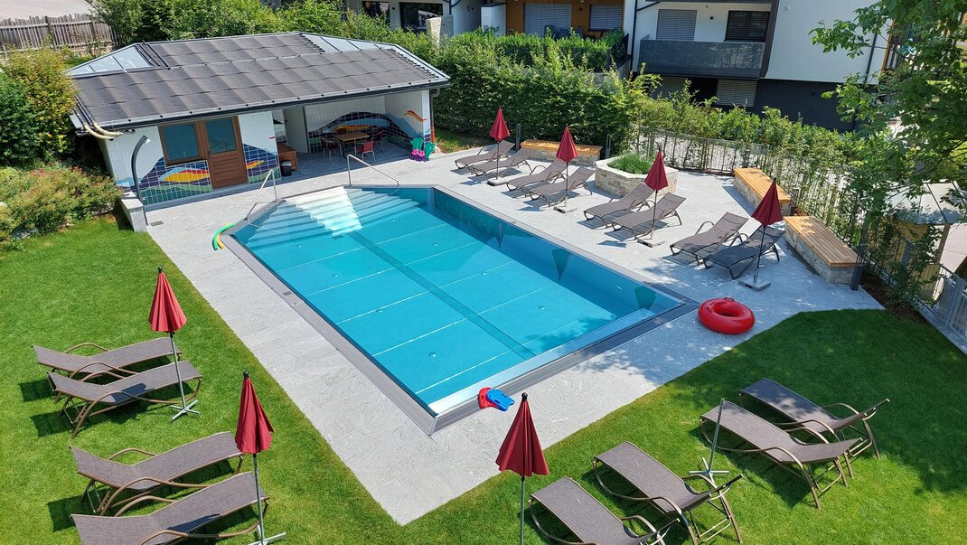In the summer time you may enjoy a beautiful day at our solar-heated outdoor pool while the children are having fun at the play area with trampolin, slidges, swings, table tennis, bobby cars, climbing wall ....