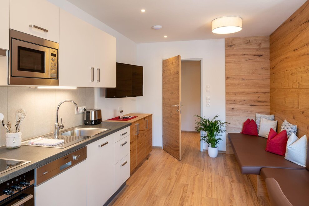 The classic apartement E1 is 60 m² large and is equipped with a modern kitchen, 2 bedrooms, combined kitchen-living room, bathroom and shower, separate WC, cable TV, wifi internet access and a large, southsided panorama balcony.