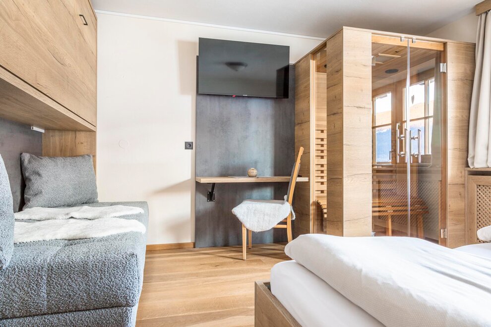 The cozy ground floor room in country house style invites you to relax with its infrared cabin and private terrace with grilling facilities. Perfect for couples or small families!