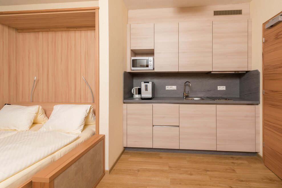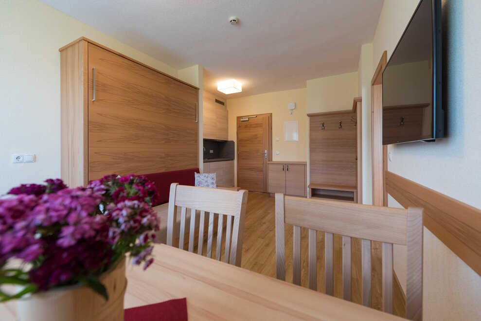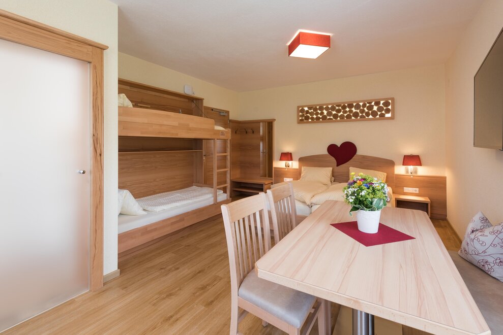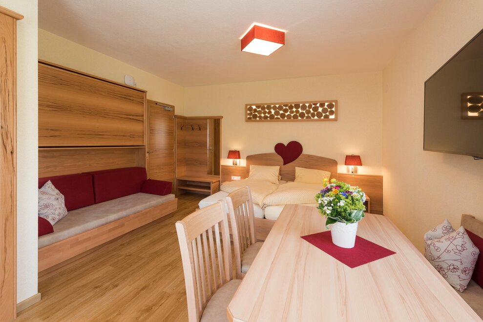 It is equipped with a double bed with quality QUL-certified relaxation mattresses, a cozy seating corner with table, cable TV, free WiFi, underfloor-heating and balcony with mountain view and afternoon sun. Another special feature is the couch, which can be turned into a bunk bed if needed.Room/apartment features