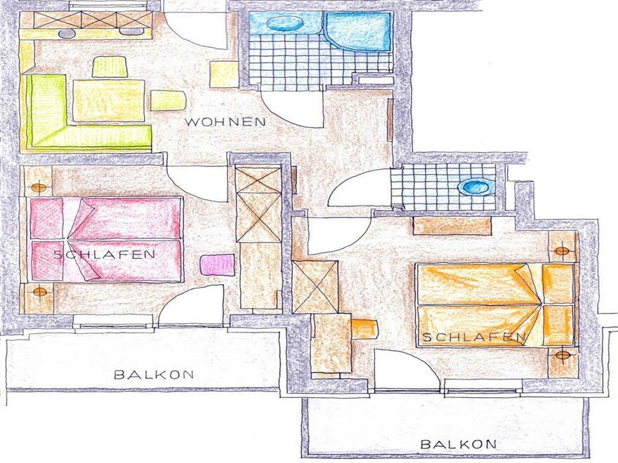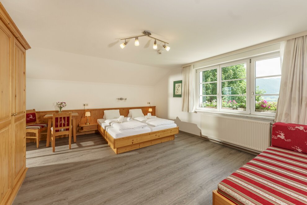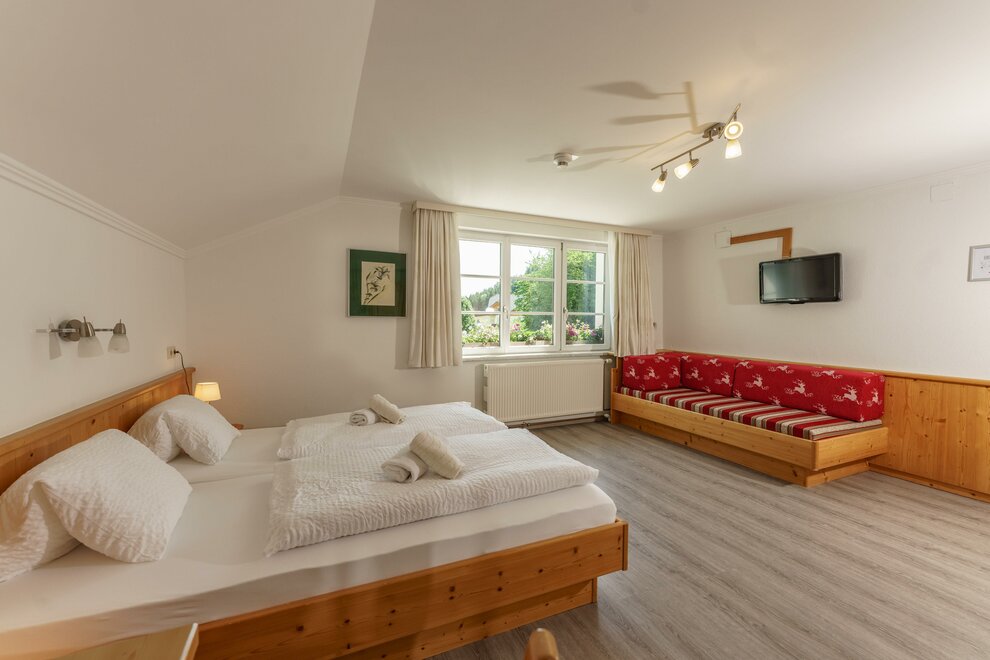 Family rooms with separate beds, floor beds or separate beds for the children, shower / WC, hairdryer, free W-Lan, partial with 2 times Flat TV with cable reception, balcony, balcony furniture.