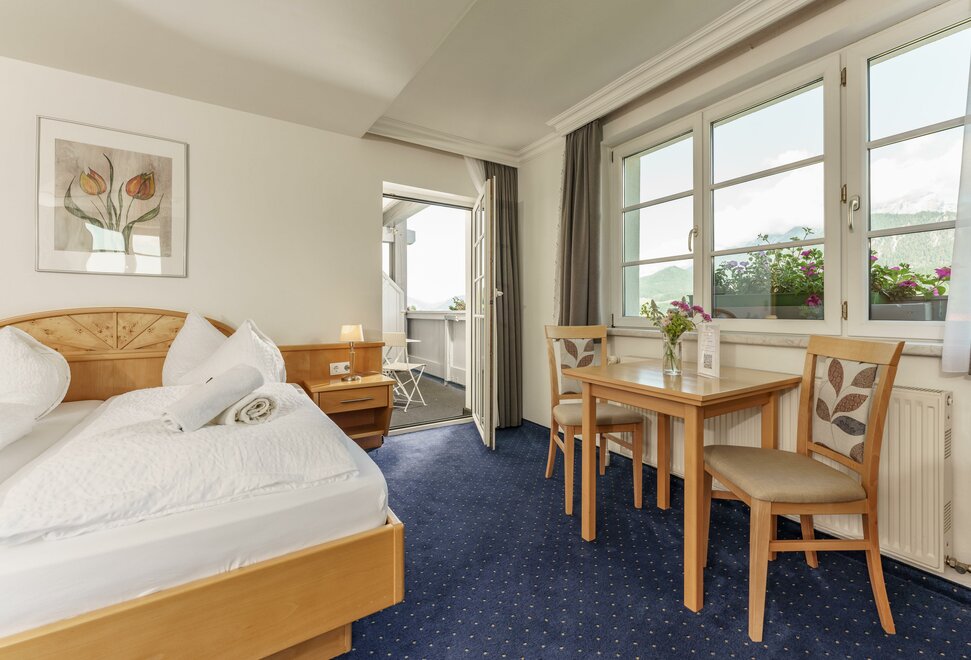 Newly renovated comfort double room with box spring beed and balcony with balcony furniture, view of the valley, the garden and the mountains! Flat screen TV, shower / toilet, hairdryer, free wifi, fridge.