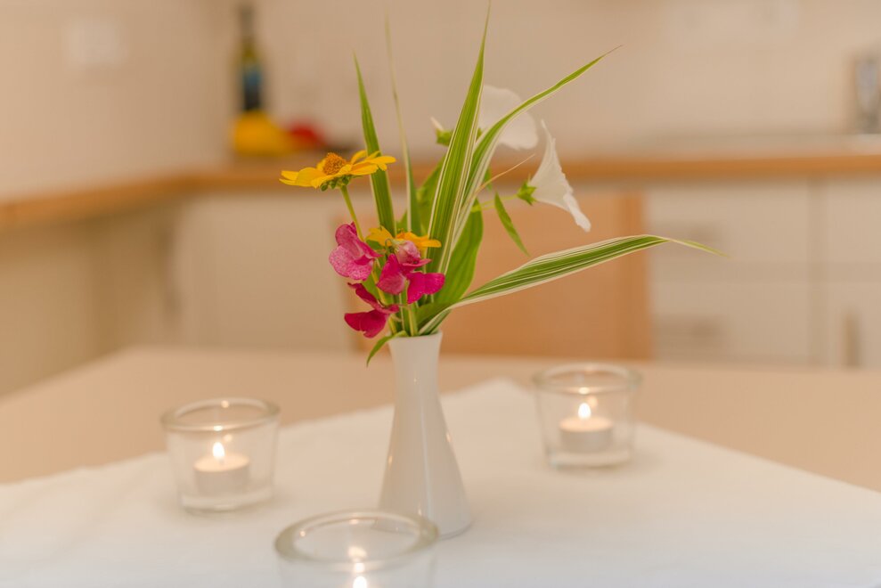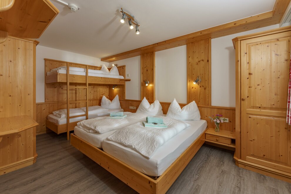 Our family room on the ground floor is for max. 6 people and has 67sqm. It has 3x satellite TV, free W-Lan and is accessible via a separate entrance on the ground floor. It is equipped with a living room, two separate bedrooms (1x1 double bed, 1x1 double bed and a bunk bed), a large bathroom with 2 sinks, 2 toilets, one of which is separate and an entrance hall with cloakroom. There is also a small terrace on the west side of the house.