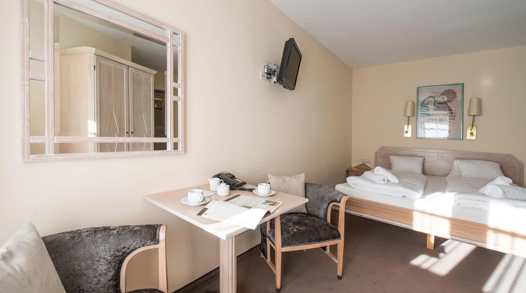 For up to 4 people on the third floor with an attic: Two-room apartment with an entrance area, shower, WC, kitchenette, living/sleeping area with a double sofa bed, bedroom with a double bed, balcony, safe, hairdryer, 2x cable TV, and telephone.