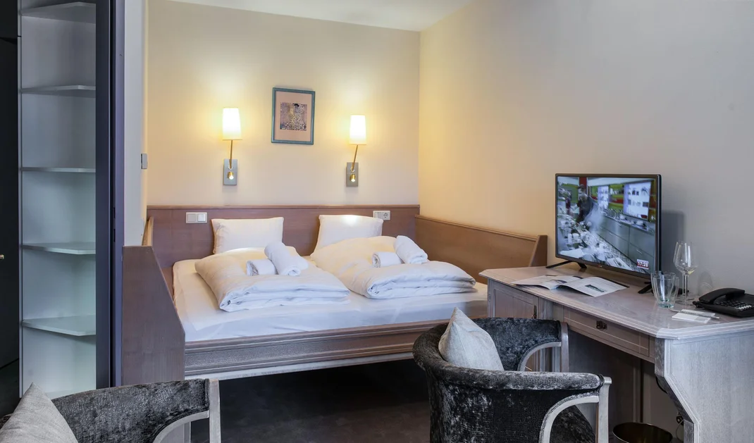 For up to 5 people: Two-room apartment with an entrance area, shower, WC, kitchenette, living/sleeping area with a double bed and a single bed for the 5th person, 1 bedroom with a double bed, balcony, safe, hairdryer, 2x cable TV, and telephone.