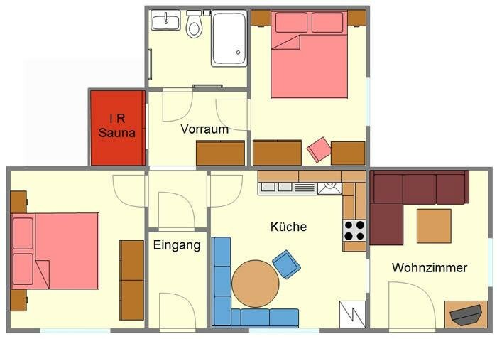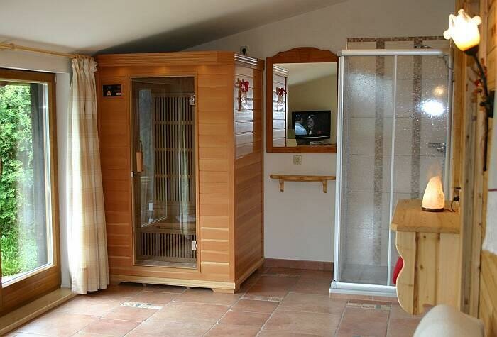 Apartment Enzian ideal for 3-5 people (70m²): Entrance hall, living room with dining area and fully equipped kitchen - all dishes, electric stove with oven, dishwasher, fridge and freezer, coffee maker, kettle, microwave oven and radio. 2 bedrooms with double beds (if required cot or extra bed) and comfortable living room with large couch and LCD TV, bathroom with shower and toilet, infrared sauna for your wellness pleasure and terrace with garden furniture.