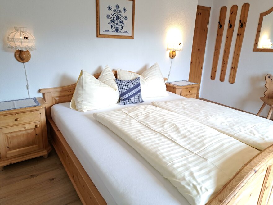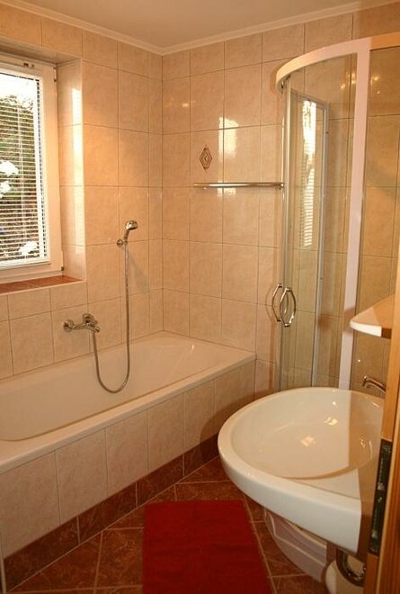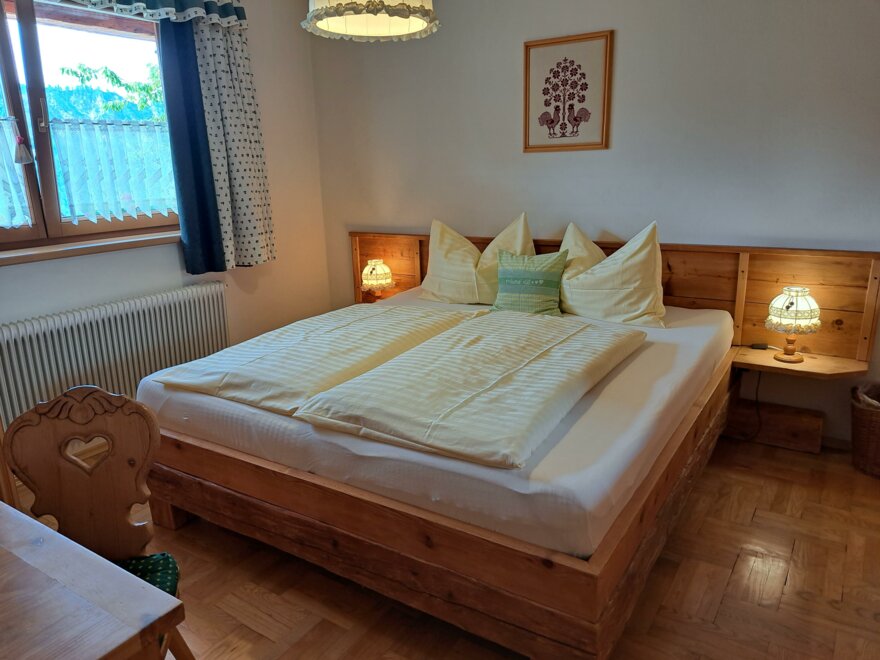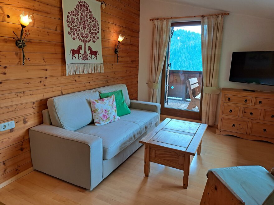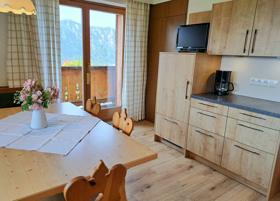 Apartment Bergblick ideal for 5-8 persons (about 100 m²): Entrance hall, living room with dining area and fully equipped kitchen - all dishes, electric stove with oven, dishwasher, fridge and freezer, coffee machine, kettle, microwave oven, satellite TV and radio. 3 bedrooms with double beds (if required cot and extra bed) and separate cozy wellness-living room (infrared sauna, shower, couch, LCD TV), bathroom with shower, bath and toilet, separate toilet. Great view from the balcony with covered, rustic sitting area.