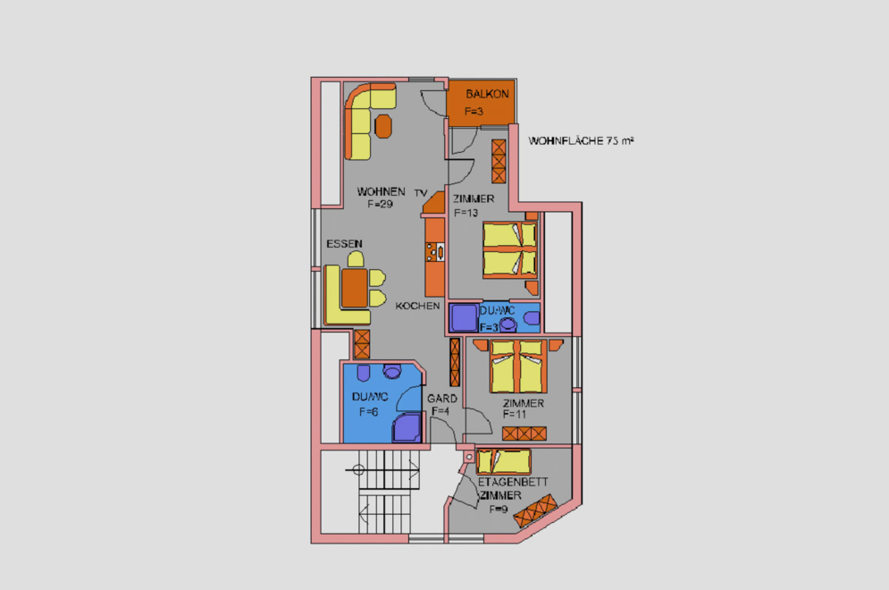 The apartment for 2 - 6 persons is located on the upper floor and has 3 bedrooms, a living room, kitchen with large dining table and dishwasher, electric stove, oven, refrigerator, microwave, coffee machine and kettle, 3 bathrooms, 2 WC, 2 flatscreen TVs, CD player, W-LAN, an infrared sauna and a balcony.
