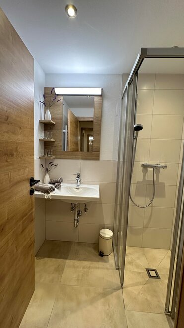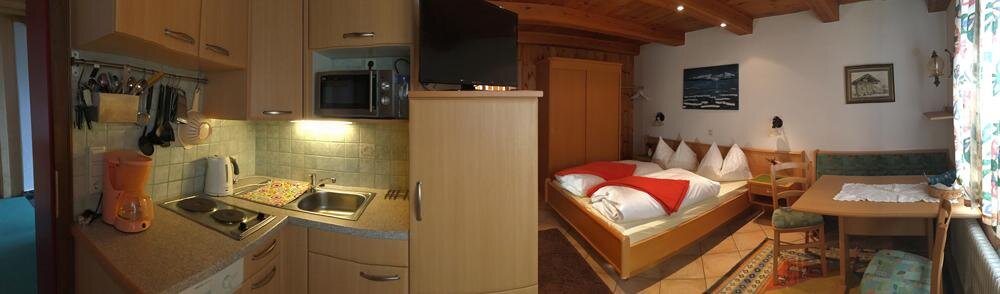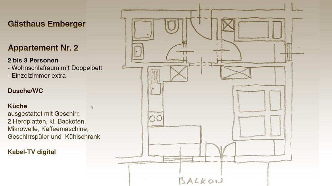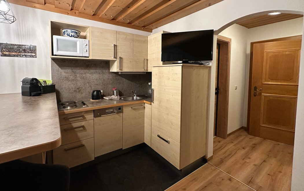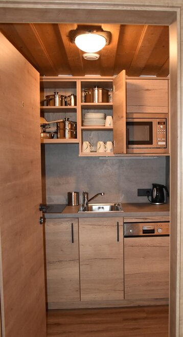 The apartment has a kitchenette with dishes, dishwasher, coffeemaker,... Shower/WC. Cable-TV. Free Wlan Access in our house.Room/apartment features
