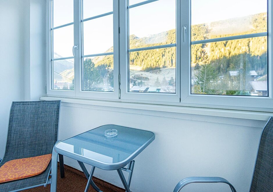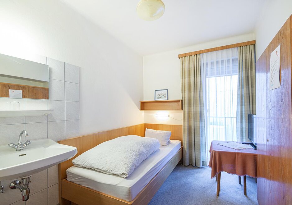 Small, cosy single room with shower on the corridor. From the balcony you have a famous view to the mountains.