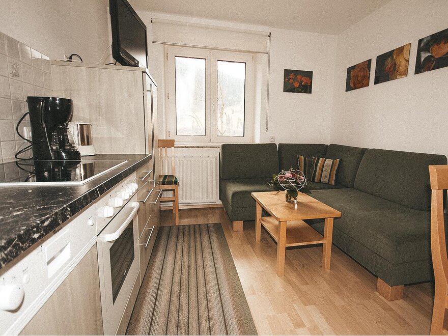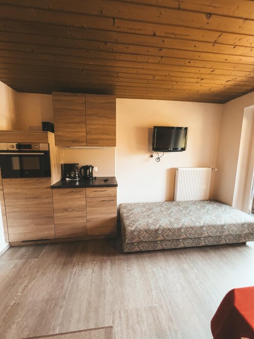 This cozy apartment for up to 3 people features a bedroom with a double bed and sofa, as well as a living-dining area with a seating area, kitchenette, coffee machine, and TV. It also offers a shower, a separate WC, and a balcony.