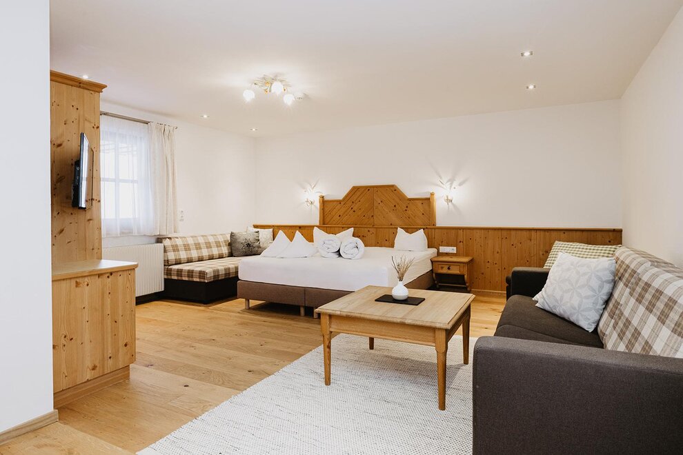 Our generous Alpensuite with amazing view to the Hochkönig has got enough room for families up to five persons. The Suite has got a double bed, two sofa beds as well as TV, safe, seating corner, phone, free WiFi and a privat balcony. The bathroom is equipped with bath, toilet, hair dryer, tissues, shampoo and soap.