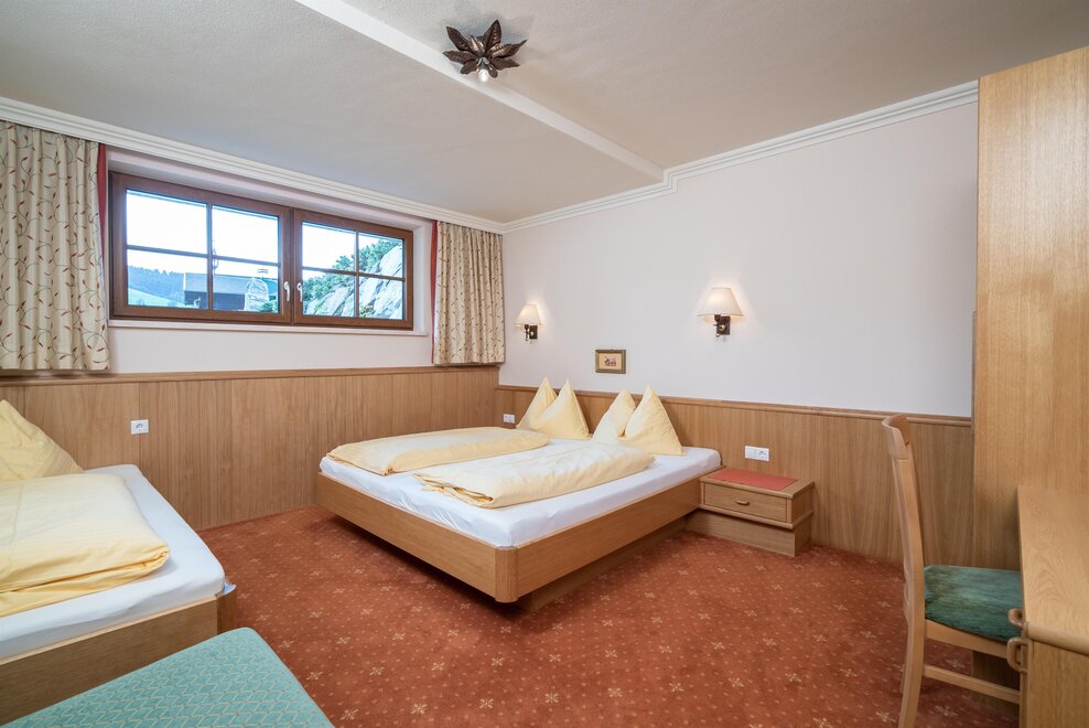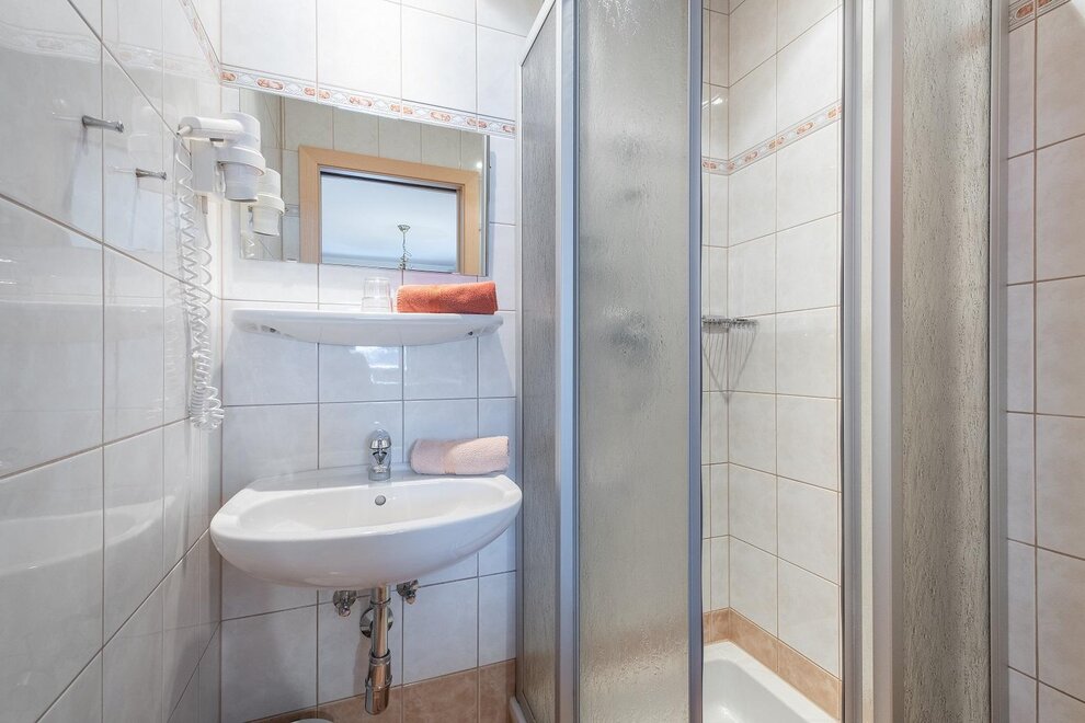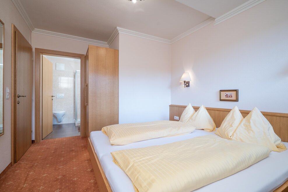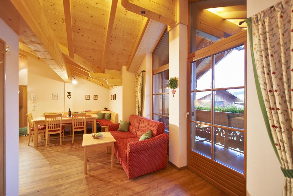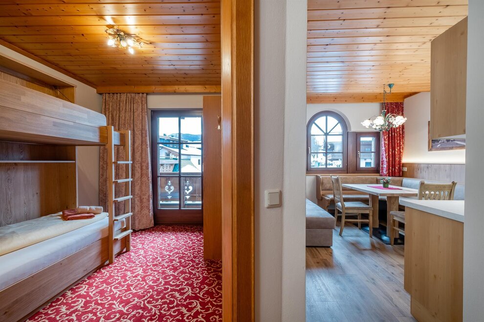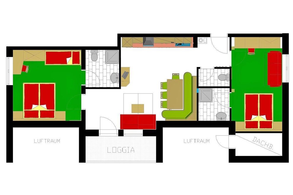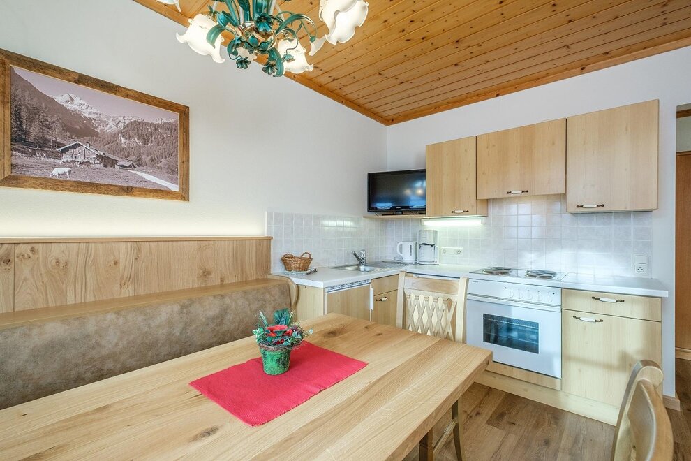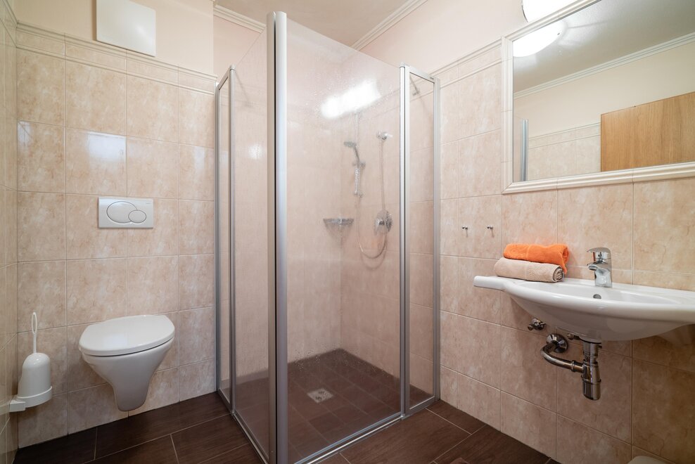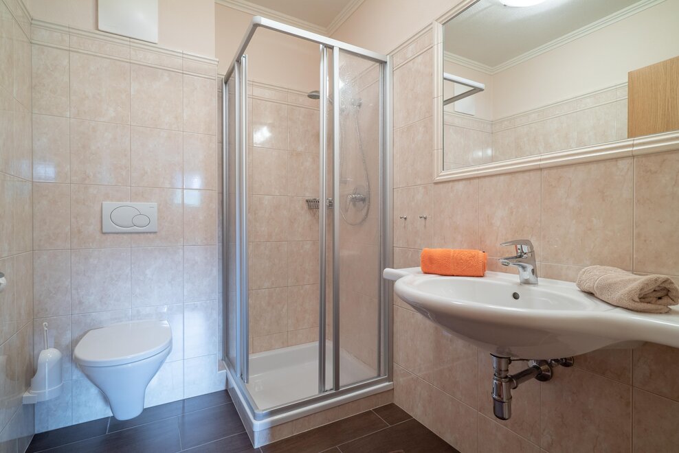 1 double room, 1 triple room with sofa bed, 1 living room with kitchen and sofa bed, 2x shower/WC, no stairs and barrier-free bathroom.