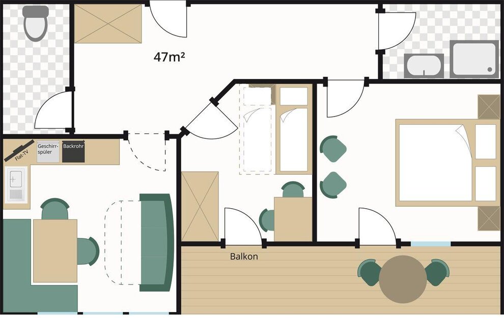 2 bedrooms, combined kitchen and living room with pull-out couch, fully equipped kitchen with dishwasher, shower/WC, free W-Lan, radio, flat-screen TV, room safe, balcony