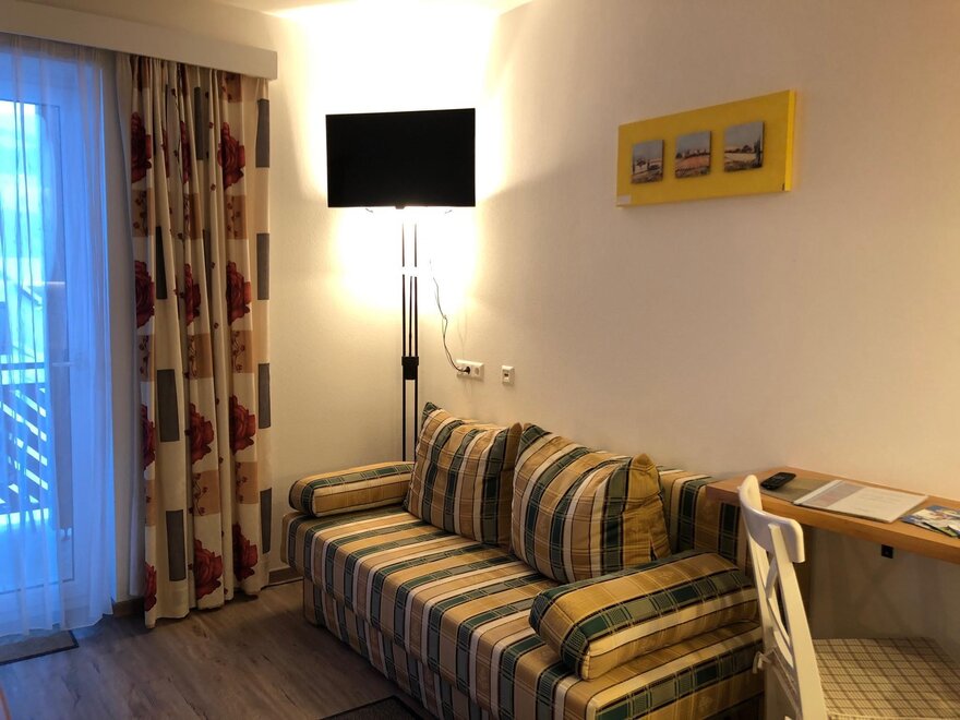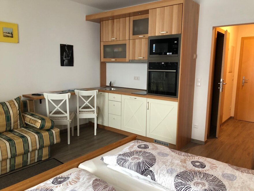 The 29 m² apartment "Alm" offers space for 1 to 2 people. The flat has a living/sleeping area with double bed, fully equipped kitchenette (incl. crockery, electric cooker, oven, coffee machine, etc.), a seating area and satellite TV as well as a storage room. The separate bathroom is equipped with shower/WC. Free W-LAN is available in the apartment. The two app. Leiterwagen and Alm are right next to each other and can therefore be wonderfully combined, e.g. for families with older children, couples of friends or 4 friends who like to travel together. A table can be reserved for your stay on the Kollerhof terrace.