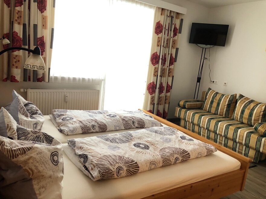 Apartment in the neighbouring house of the Kollerhof with one bedroom and living room with fully equipped kitchen, 1 bathroom with shower/WC, living room with dining area for 6 persons. A small room with a bunk bed is available for children. This apartment has its own entrance, a small garden and a balcony. Sauna, ski cellar and ski boot warmer in the Kollerhof. Towels and bed linen are included in the flat; bread roll service, ski bus stops directly in front of the house